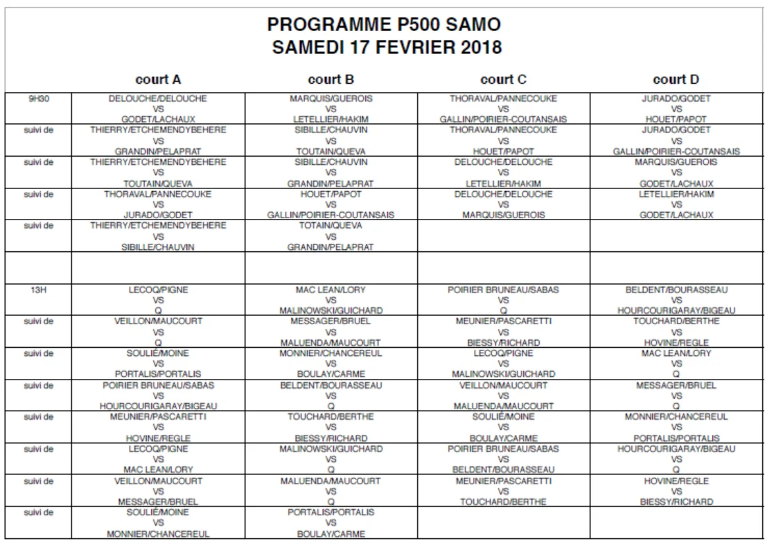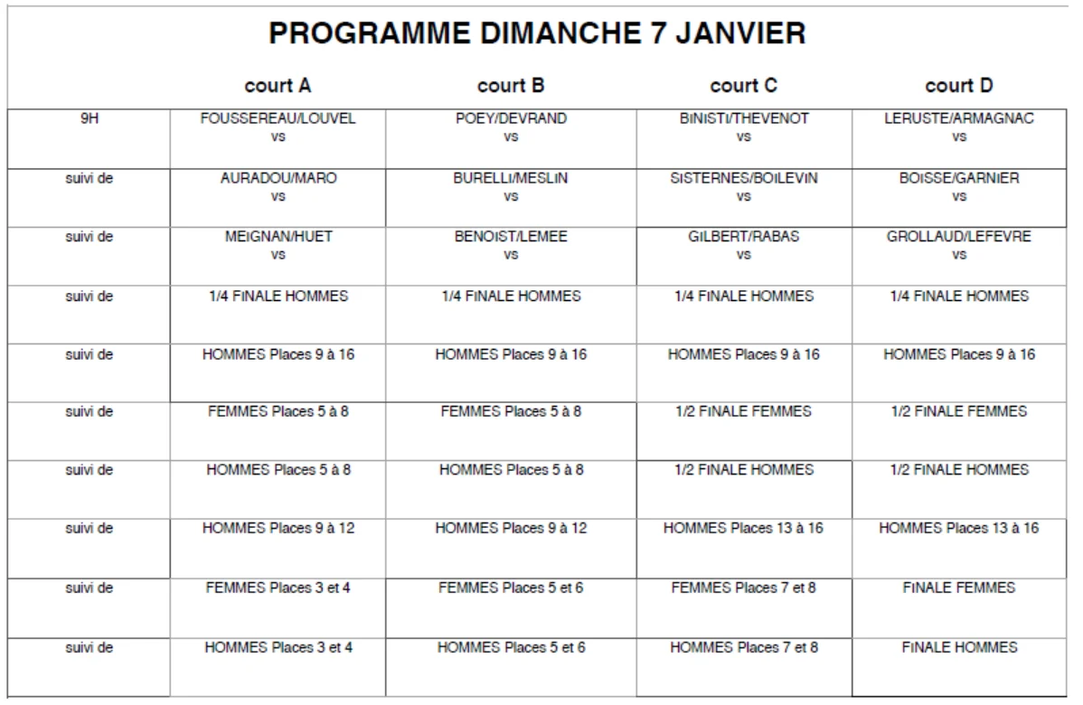 - Accueil à partir de 8h30 le dimanche pour début des tableaux finaux à 9h