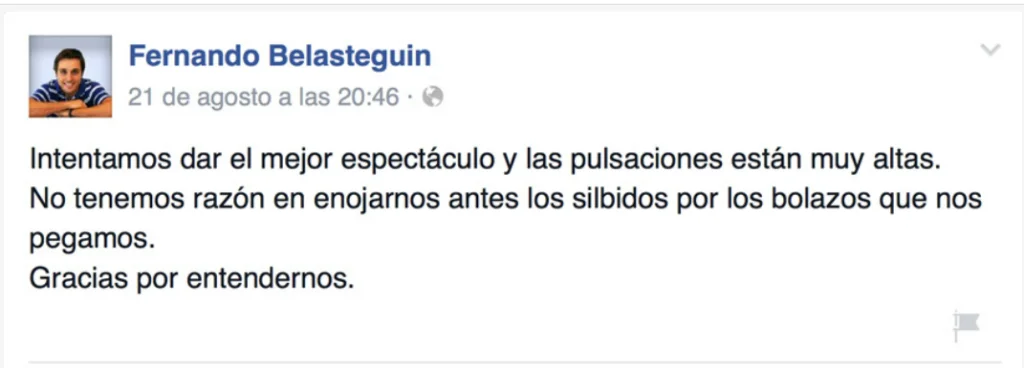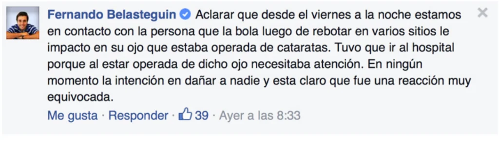 Suite à ce craquage, le lendemain des faits, la légende de Pehuajo présenta ses excuses lors de son arrivée sur le terrain devant toute une tribune bondée.