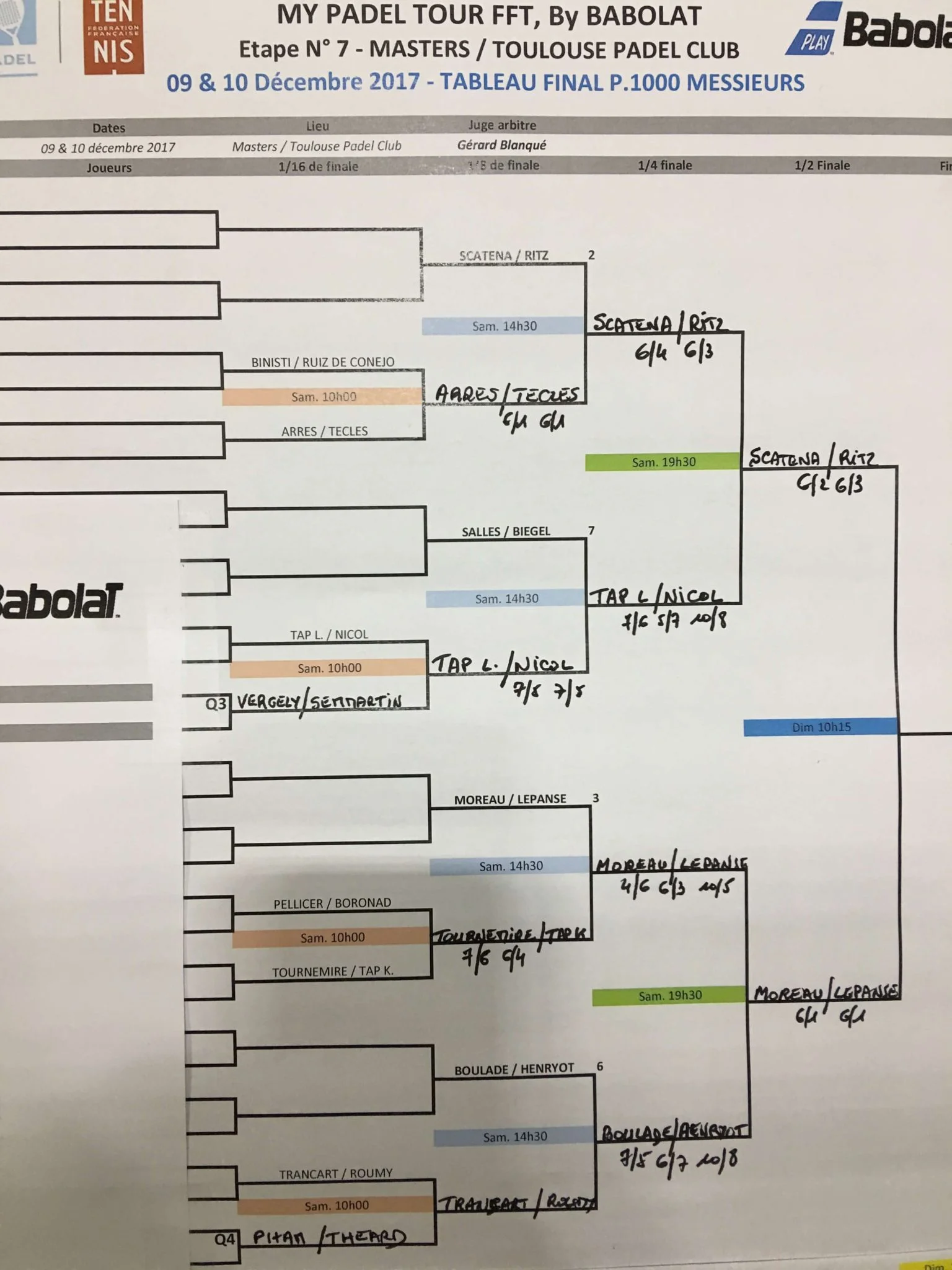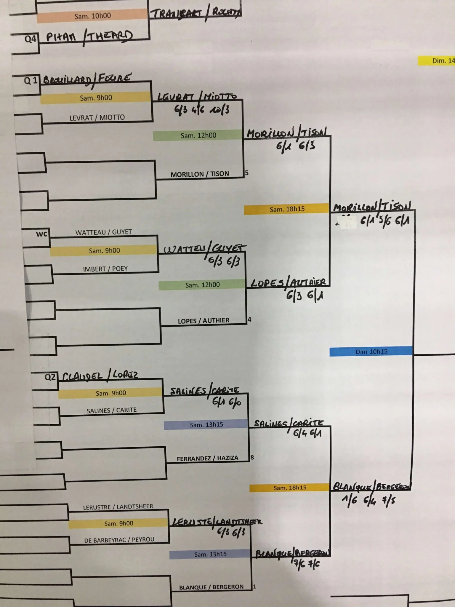 Chez les messieurs, si deux quarts de finales ont été expéditives avec Ritz / Scatena et Moreau / Le Panse, nous avons eu le droit à deux gros matchs, Tison / Pommier qui passe la paire lyonnaise Authier / Lopes en 3 sets (6/1 3/6 6/1) et surtout l’incroyable match entre Bergeron / Blanqué et Carité / Salines. Les français réussiront à remporter ce match pourtant mal embarqué avec la perte du 1er set 6/1. La paire Carité / Salines servira même pour le match. Mais non, le mental de nos français force le respect. Ils remportent ce match au bout du suspens 1/6 6/4 7/5.