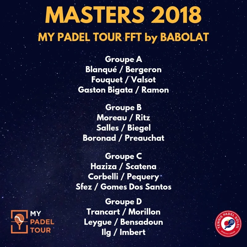 Ce week-end, nous aurons le Masters du My Padel Tour 2018 à Tennis Padel Soleil, à Beausoleil. Quelles sont les paires présentes à cette grande épreuve de padel ?