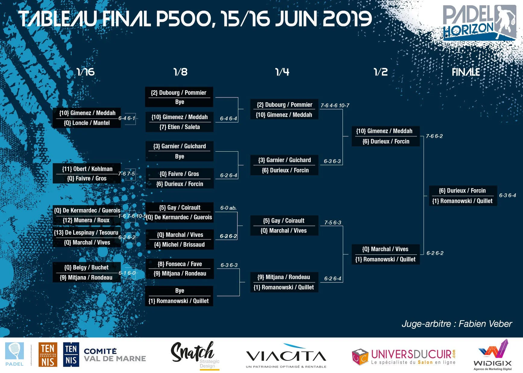 - Padel Horizon proposait un P500 hommes où les normands Marc Durieux/Maxime Forcin s’imposent.Comme tous les mois, Padel Horizon affichait un tableau particulièrement relevé pour son P500. La paire Quillet/Romanowski a tenu son rang jusqu’en finale avant de craquer face aux normands Marc Durieux et Maxime Forcin. Deux autres paires ont marqué les esprits à commencer par le duo Gimenez/Meddah qui s’est hissé jusqu’en demi-finale après avoir écarté la tête de série numéro 2 Dubourg/Pommier.L’autre sensation vient de Florian Marchal et Manu Vives. Issus des poules qualificatives, les deux compères franciliens ont confirmé leur potentiel en allant jusqu’en demi-finale ne cédant que face à Quillet/Romanowski après s’être offert les têtes de série 4 (Michel/Brissaud) et 5 (Gay/Coirault). Un duo à suivre de près dans les prochains mois.
