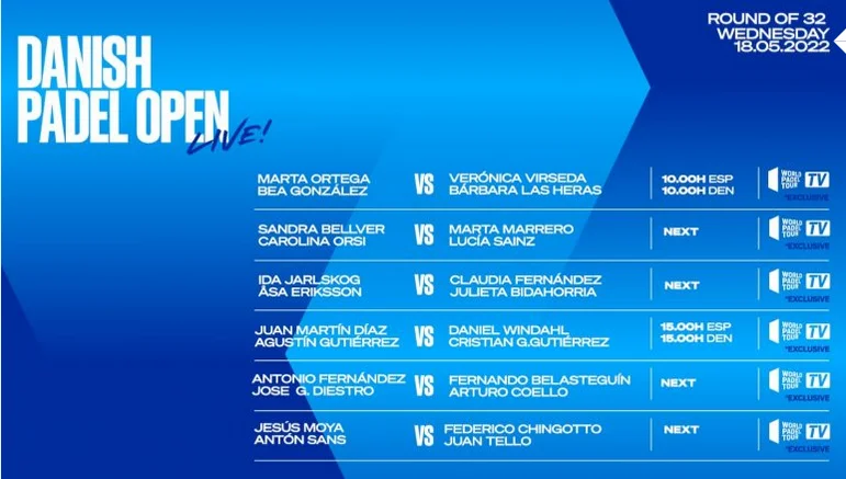 Suivez en direct la deuxième partie des seizièmes de finale au World Padel Tour Danish Open.