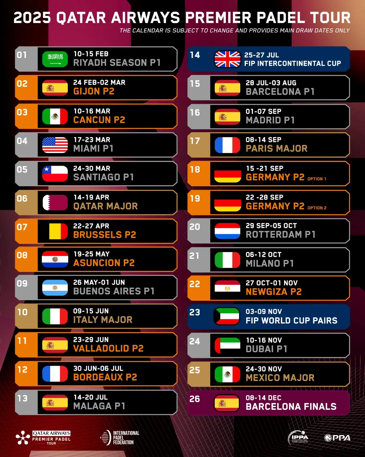 Dans la foulée de cette annonce, la FIP a également mis à jour le calendrier Premier Padel 2025 :