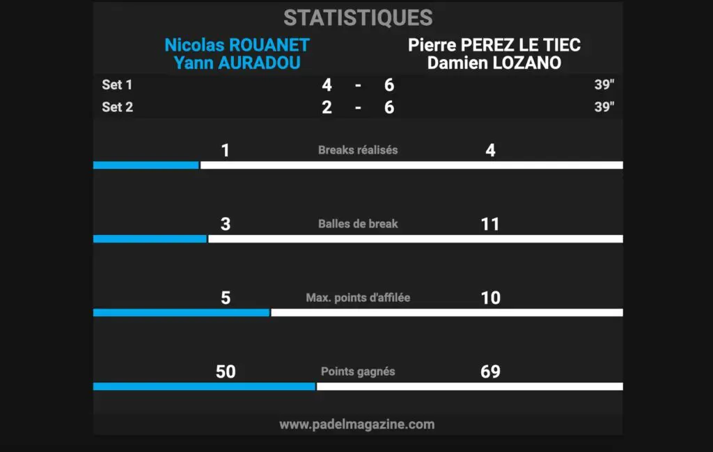 Lors de la première manche Pierre et Damien réalisent deux jeux blancs et marquent 10 points consécutifs ce qui leur permet de prendre très rapidement l’avantage et ainsi creuser un peu plus l’écart. Dès l’entame du second set, ces derniers réalisent le break et mènent 2/0 avant de se faire rejoindre à 2/2. Très solides dans le jeu mais également sur le plan mental, la paire Lozano / Perez Le Tiec ne laissent rien passer et fustigent leurs adversaires. Ils s’imposent donc 6/4 – 6/2 et remportent ainsi leur premier titre ensemble de la saison.