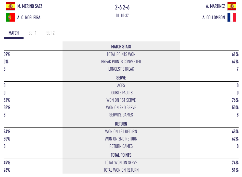Favoris sur le papier, Collombon et Martinez devaient surtout gérer la reprise après plusieurs semaines sans tournoi. Mission réussie : elles ont pris le match en main dès l’entame, réalisant un break rapide dans chacun des sets pour installer leur rythme et mettre la pression sur leurs adversaires. Très solides en retour, elles ont fini par creuser l’écart une deuxième fois dans chaque manche, pour conclure en 1h10.