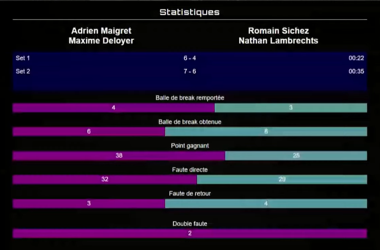 Côté statistiques, l’avantage est net pour les vainqueurs : 38 points gagnants contre 25 en face. Les fautes directes restent proches (32 pour Maigret / Deloyer, 29 pour Sichez / Lambrecht), mais l’efficacité offensive de la TS2 a pesé lourd dans les moments clés.