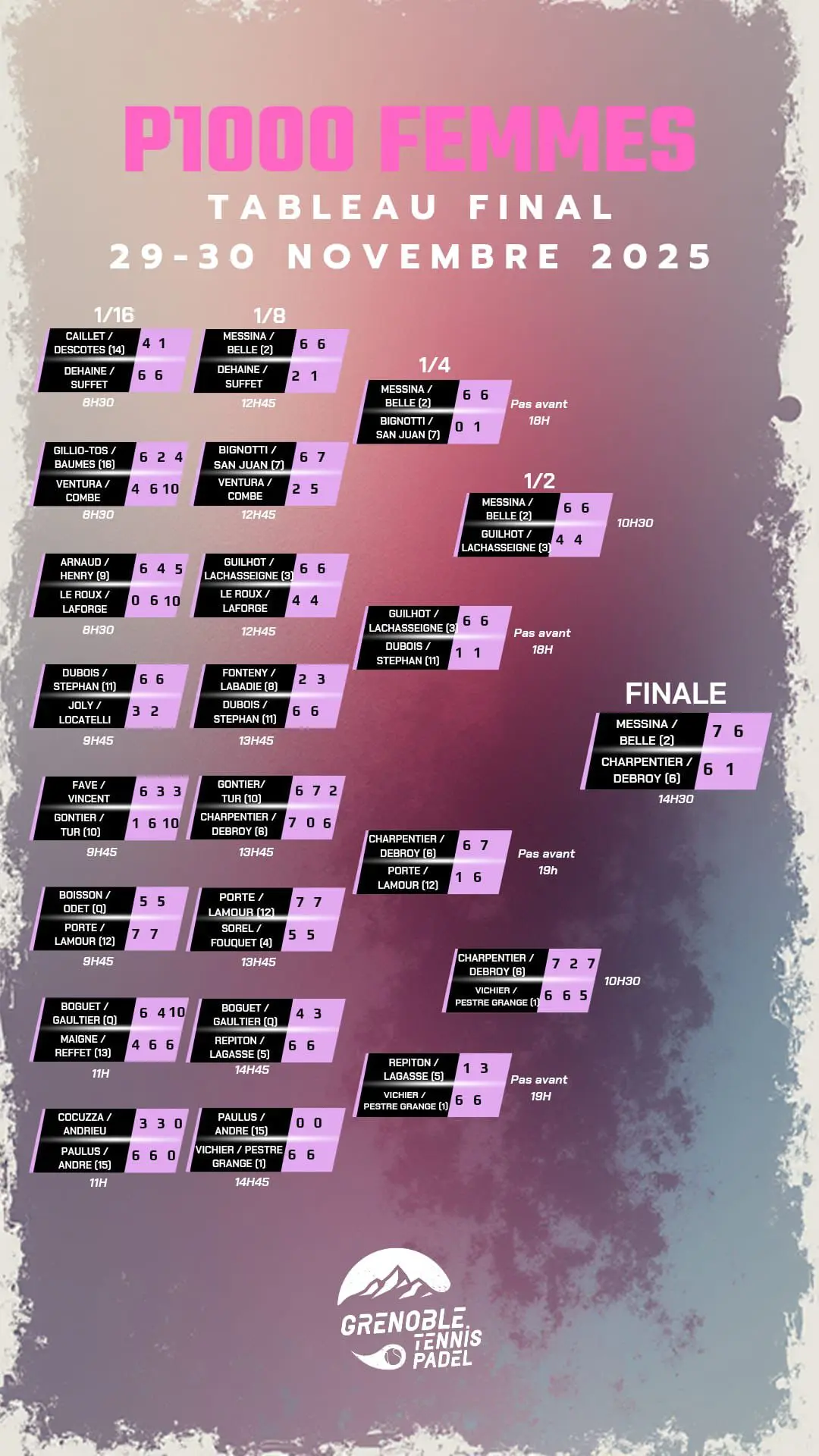 La tête de série n°2, Chiara Messina et Alexandra Belle, a fait un gros tournoi au P1000 dames de Grenoble Padel, en s’imposant en finale face à la surprenante paire Charpentier / Debroy (TS6) sur le score de 7/6 6/1. Un titre maîtrisé de bout en bout… et un premier P1000 de la saison pour les deux joueuses.