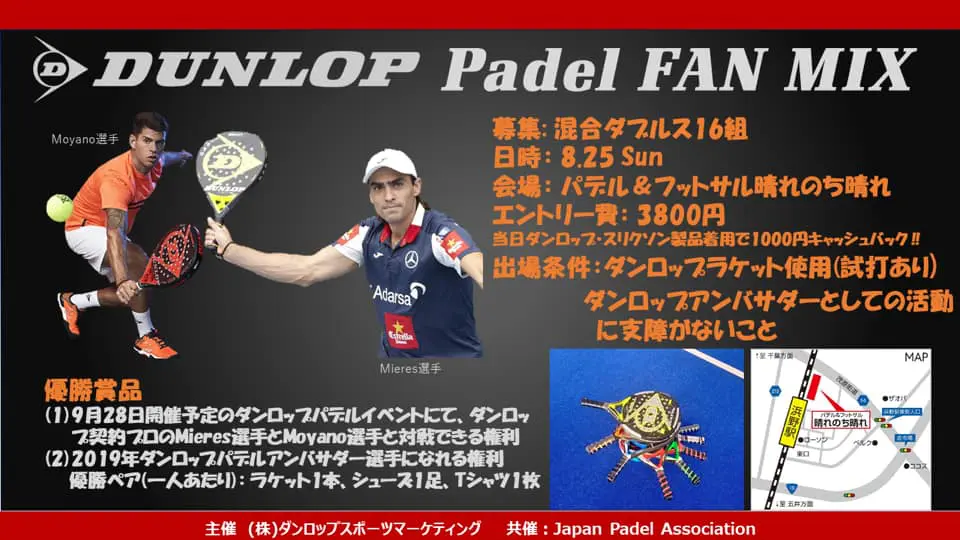 L´Association Japonaise de Padel fait parler d´elle grâce à certains joueurs, mais aussi de par son envie de progresser. La distance avec le meilleur padel au monde rendant difficile son évolution, c´est par les sponsors et notamment les marques, que le padel gagne en qualité. Au mois d´août Dunlop proposera la visite de Mieres et Moyano.
