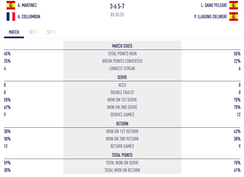 Les statistiques parlent d’elles-mêmes : 38 fautes directes contre 26 pour leurs adversaires, et surtout 0 balle de break convertie sur 3, contre 2 sur 9 pour les Espagnoles, qui ont su faire la différence dans les moments clés. Malgré un second set accroché, Collombon et Martínez ont manqué de réalisme pour faire basculer la rencontre.