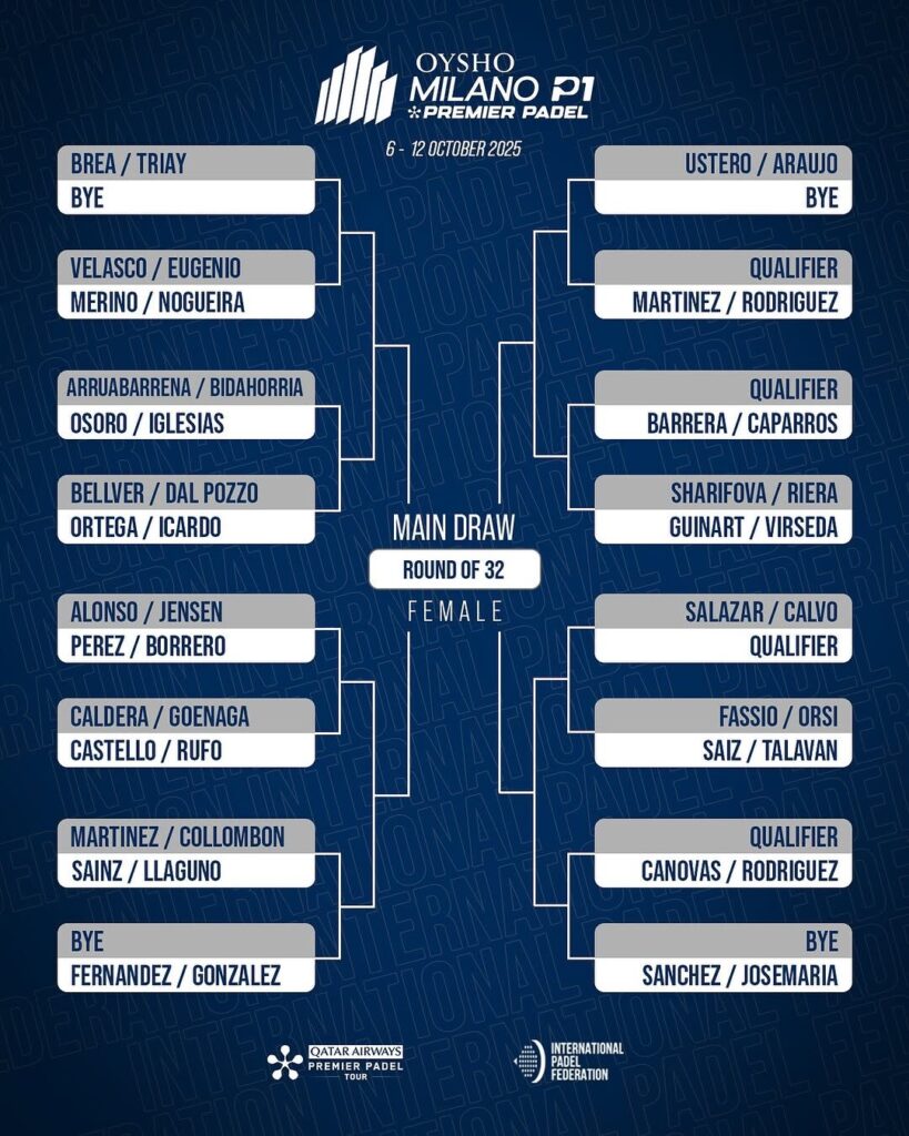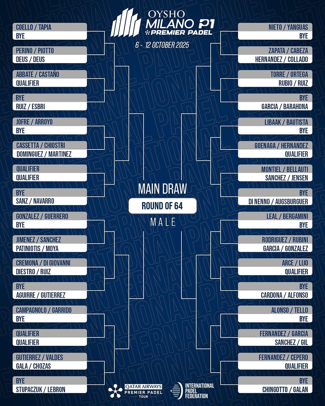 Dans l’autre moitié du tableau, Coki Nieto et Mike Yanguas se trouvent dans la même zone que Di Nenno / Augsburger, un possible choc en quart de finale entre ces deux équipes. Galán et Chingotto, eux, auront un parcours relevé : ils pourraient croiser Edu Alonso / Juan Tello en huitièmes, puis Bergamini / Leal en quarts. Autant dire que le spectacle est garanti à Milan.