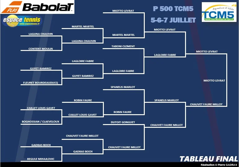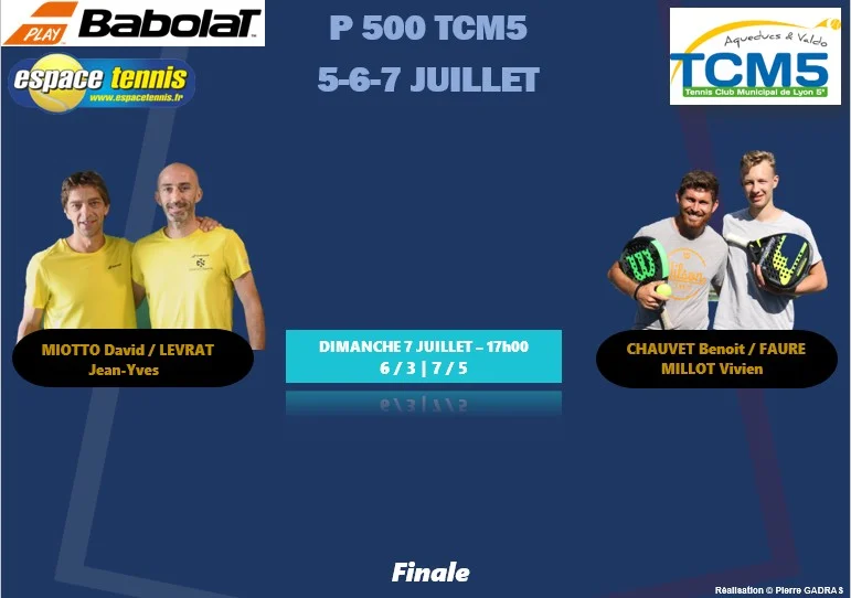 Le P500 Hommes du TCM5 a vu triompher la tête de série numéro 1, MIOTTO / LEVRAT, face à la paire CHAUVET FAURE MILLOT, sur le score de 6/3 7/5 dans un plateau lyonnais relevé. La paire MIOTTO / LEVRAT avait sauvé une balle de match contre eux dans leur quart de finale contre les frères MARTEL.