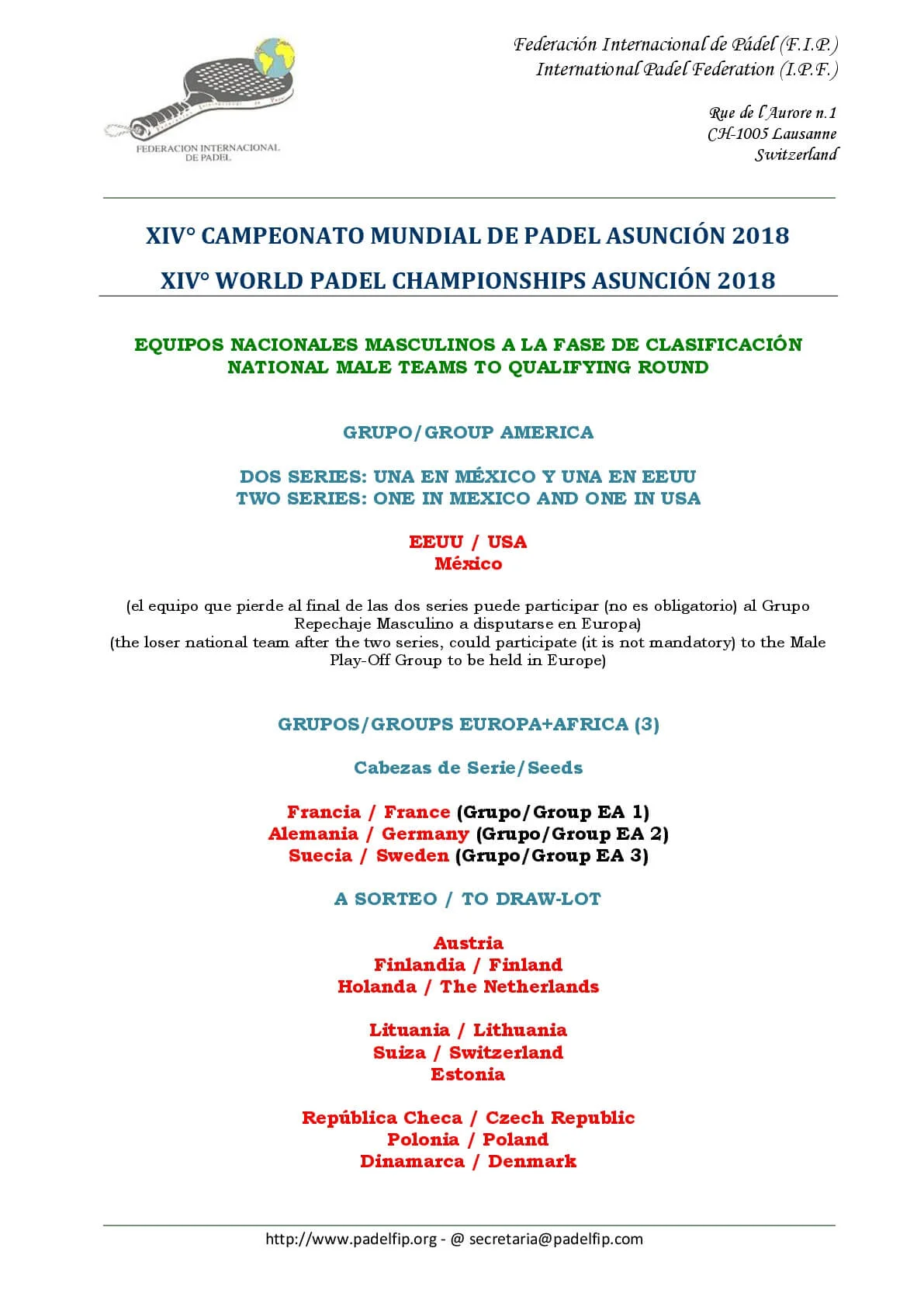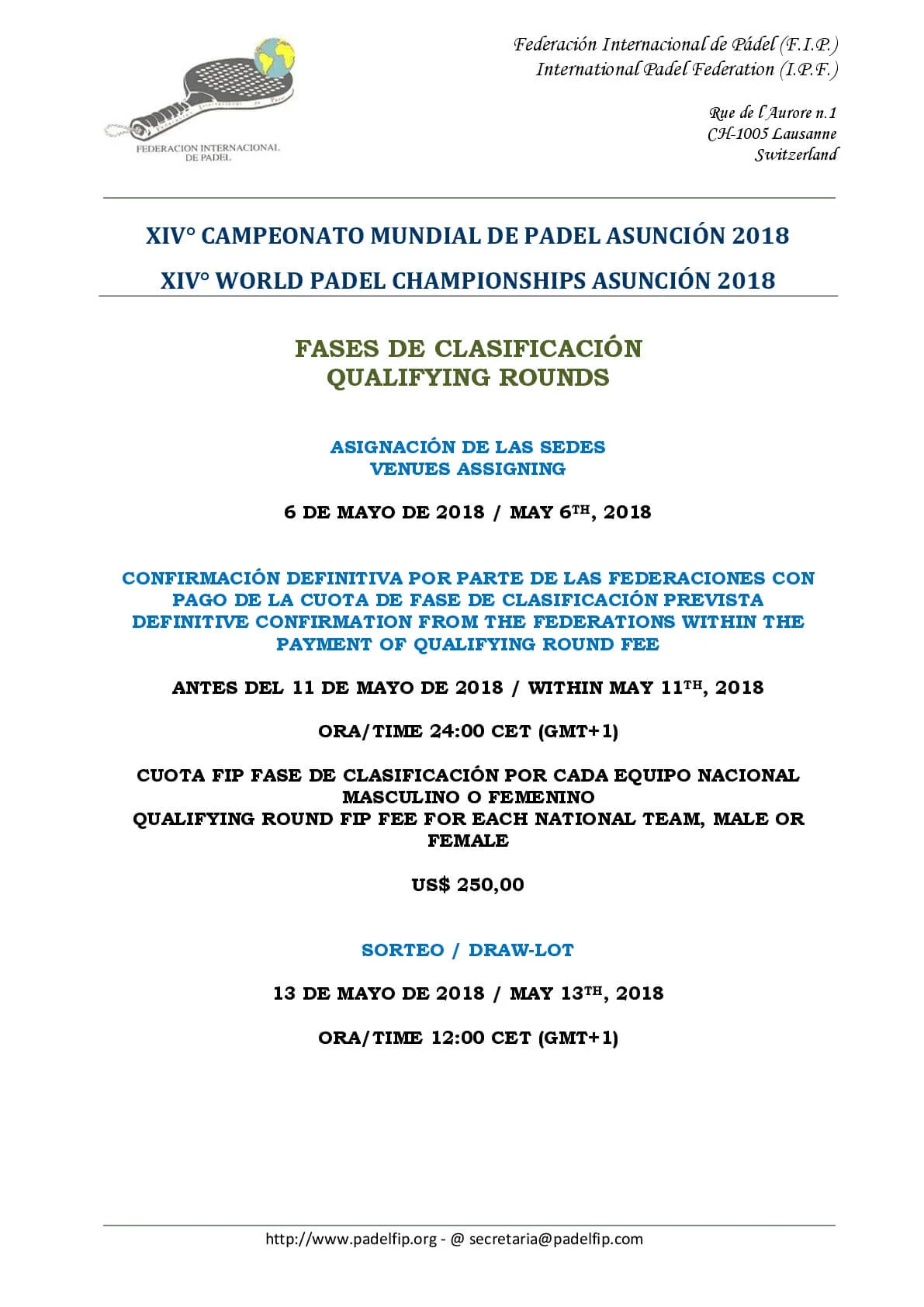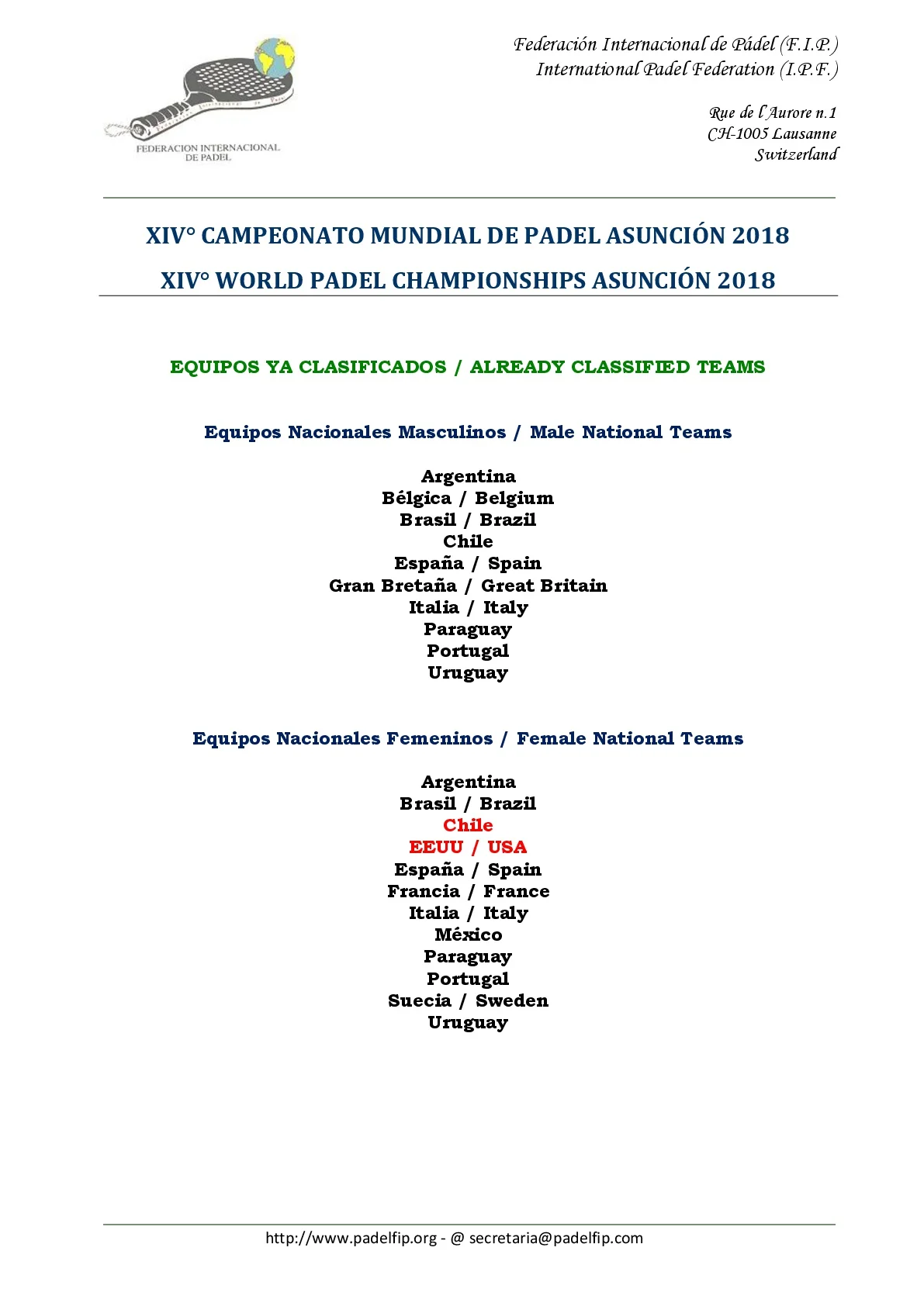 La Fédération Internationale de Padel nous en dit plus sur les phases de qualifications dames et messieurs des XIVe championnats du monde de padel 2018 dont les phases finales auront lieu à Asunción la capitale du Paraguay.