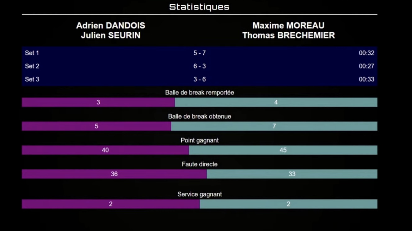 Dans le set décisif, la force de frappe de Thomas Bréchemier fait très mal, tandis que Maxime Moreau apporte une grande régularité. Malgré un léger relâchement au second set, les stats basculent côté Moreau/Bréchemier sur les points importants : ils concluent 6/3.