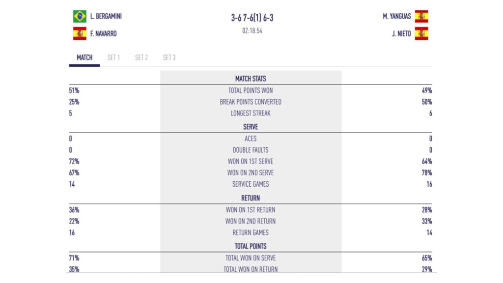 Dans le set décisif, Navarro / Bergamini prennent l’avantage dès le début avec un break pour mener 2/0, qu’ils ne lâcheront plus. Solides sur leur jeu service, ils n’offrent aucune balle de break à leurs adversaires. Ils concluent cette bataille en 2h18 de jeu, avec une vraie maîtrise tactique.