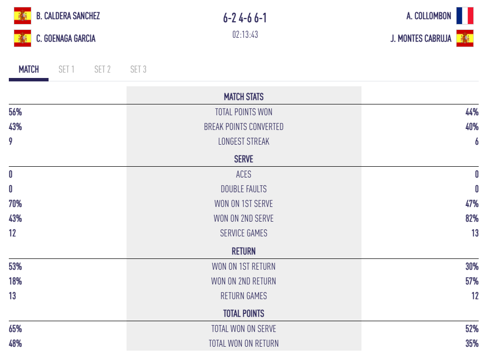 Dans la manche décisive, Caldera et Goenaga retrouvent leur stabilité. Goenaga, plus juste, réduit ses erreurs et reprend l’initiative dans les échanges. Les favorites déroulent à nouveau leur jeu pour s’imposer 6/1 et valider leur place en quarts de finale.
