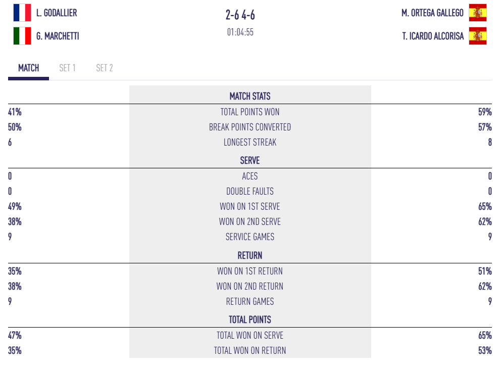 D’entrée, Ortega et Icardo ont imposé leur rythme, réalisant un double break rapide dans chaque manche grâce à une meilleure régularité et une pression constante à la volée. Le duo hispanique a su faire parler son expérience pour garder le contrôle du match, ne laissant que peu d’espaces à Godallier et Marchetti.