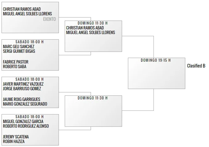 Cette partie du tableau a pour tête de série des habitués de ces joutes préliminaires : Miguel Angel Solbes Llorens(91ème)/Christian Ramos Abas(93ème). Au bout d’une seconde phase encore plus relevée, la paire qui se qualifiera rencontrera au premier tour du tableau principal un joueur mythique de ce sport : Guillermo Lahoz associé à Aday Santana (tête de série N°7).