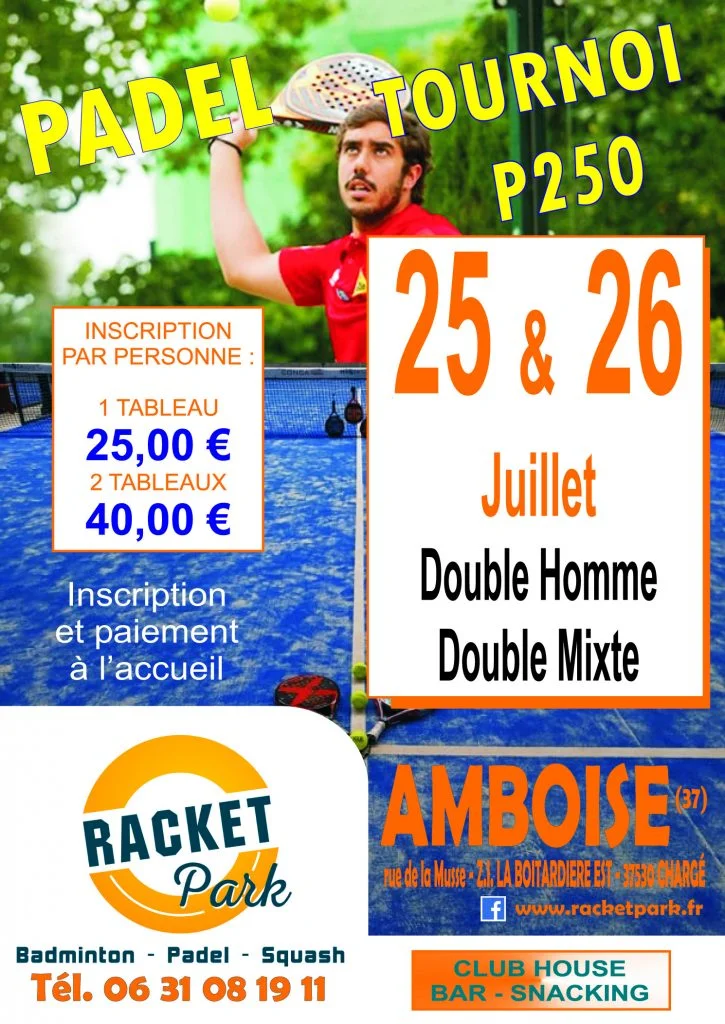 RACKET PARK vous propose les 25 et 26 juillet un P250 messieurs et mixte à Amboise. Les tournois reprennent partout en France et Racket Park a bien l’intention de poursuivre son développement.