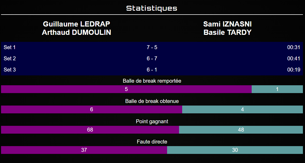 Au total, Ledrap et Dumoulin dominent les débats avec 68 points gagnants contre 48, et cinq balles de break converties sur six. Iznasni et Tardy se sont accrochés, mais ont fini par céder face à l’agressivité et à la constance de leurs adversaires.