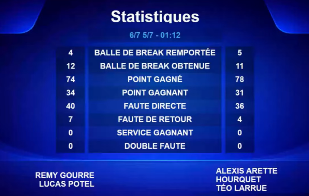 - Balles de break converties : 4/12 pour Arette Hourquet / Larrue, 5/11 pour Gourre / Potel