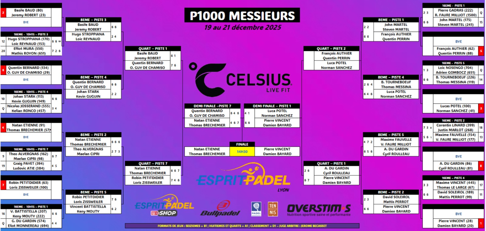 Dans le tableau masculin, la tête de série n°1, Pierre Vincent / Damien Bayard, a confirmé son statut pour atteindre la finale. En face, une paire ambitieuse Nathan Etienne / Thomas Brechemier a su se défaire de Quentin Bernard / Olivier Guy de Chamisso après un énorme match (4/6 6/4 7/6) pour se hisser au dernier rendez-vous du tournoi.