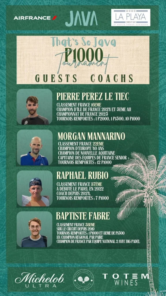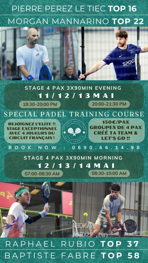 Du 14 au 16 mai 2026, le Friendly Padel Club de Saint-Martin accueillera un tournoi P1000 qui s’annonce comme l’un des temps forts du padel dans les Caraïbes. Entre compétition de haut niveau, stages encadrés par des joueurs du circuit français et soirée de clôture avec Feder, l’événement proposera une expérience complète mêlant sport et convivialité.