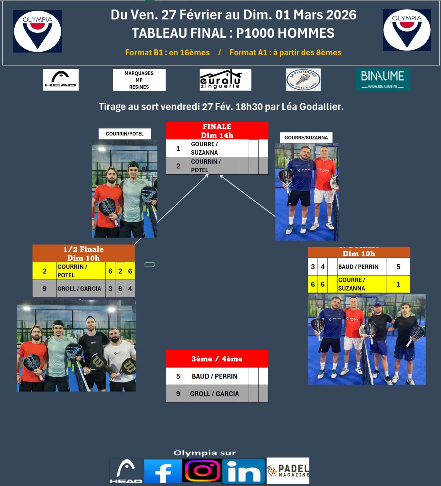 Les demi-finales du P1000 Olympia Sports ont respecté la hiérarchie avec la qualification des deux favoris. Gourre / Suzanna (TS1) affronteront Courrin / Potel (TS2) pour le titre.