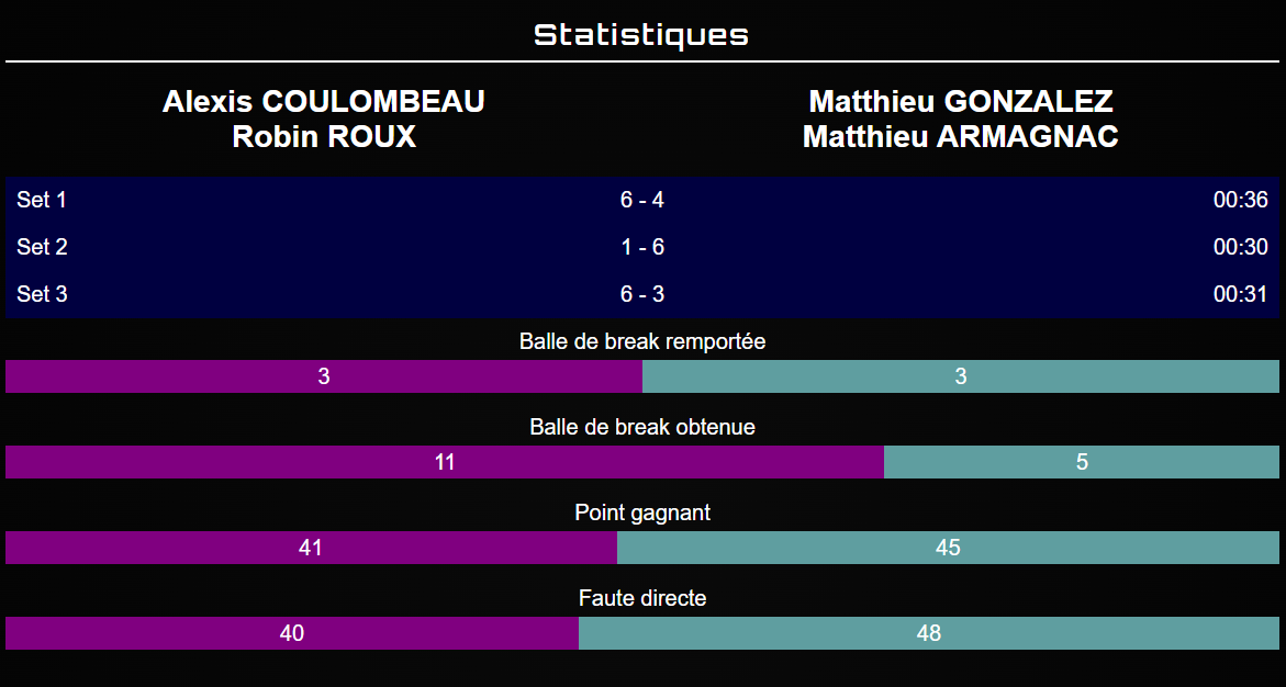 Piqués dans leur orgueil, Alexis et Robin repartent fort : break d’entrée, engagement total, et une gestion impeccable jusqu’à la fin du set.