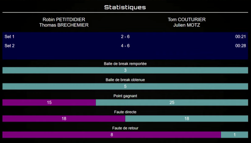 - 5 balles de break obtenues par Couturier / Motz, 3 converties