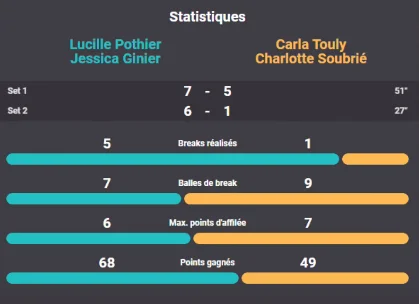 A 14h30, c’est face aux gagnantes du match opposant Buteau/Sireix à Ros/Lefevre (1 set partout à l’heure où l’on écrit ces lignes) que Jessica et Lucile tenteront de poursuivre leur sans-faute !