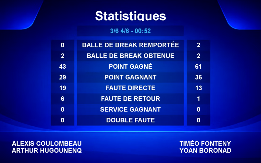 À 5-4, Coulombeau / Hugounenq obtiennent une balle de débreak… non convertie. Dans la foulée, Fonteny / Boronad concluent 6/4, sans trembler.