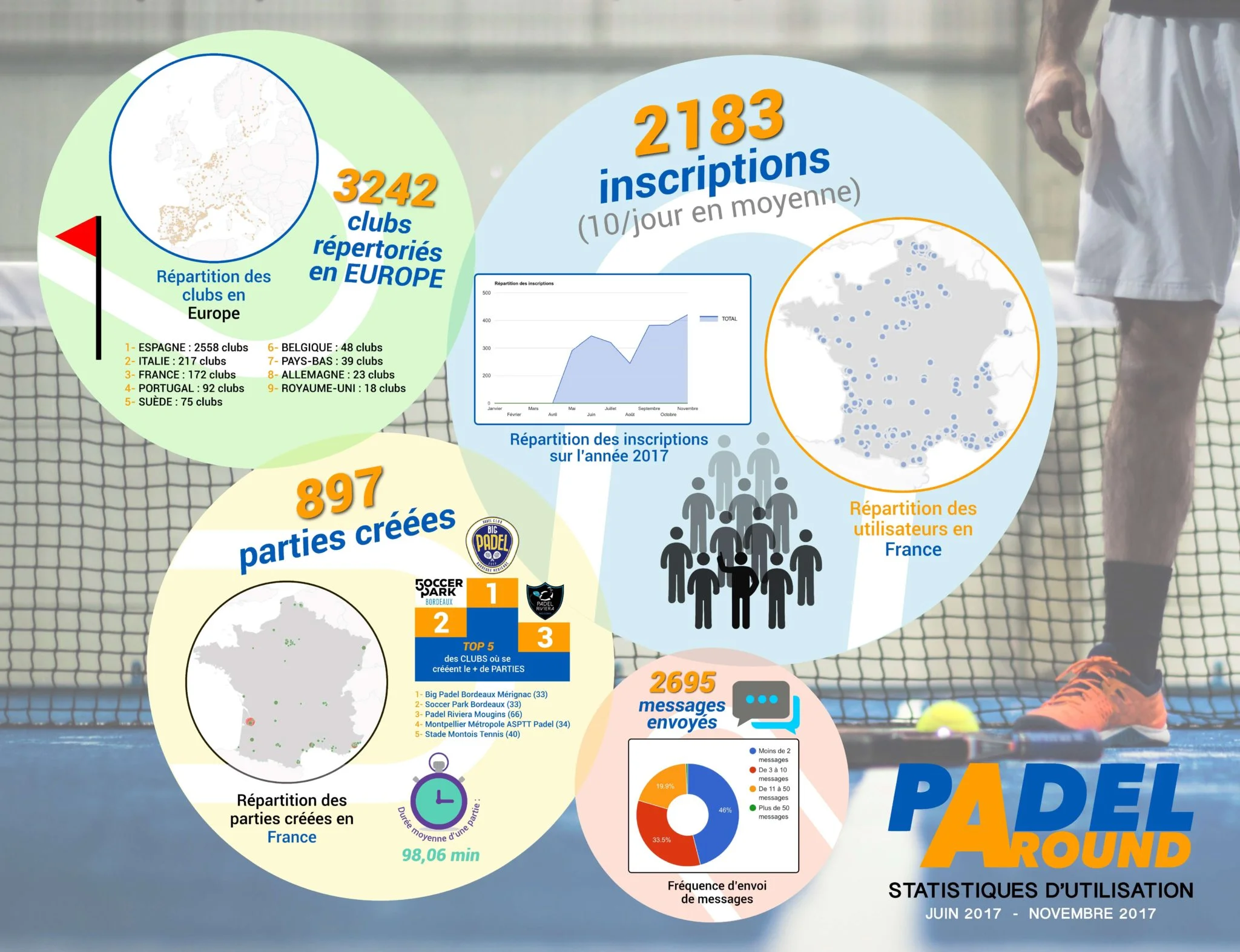 Retour en statistiques sur le premier semestre d’utilisation de l’application Padel Around.