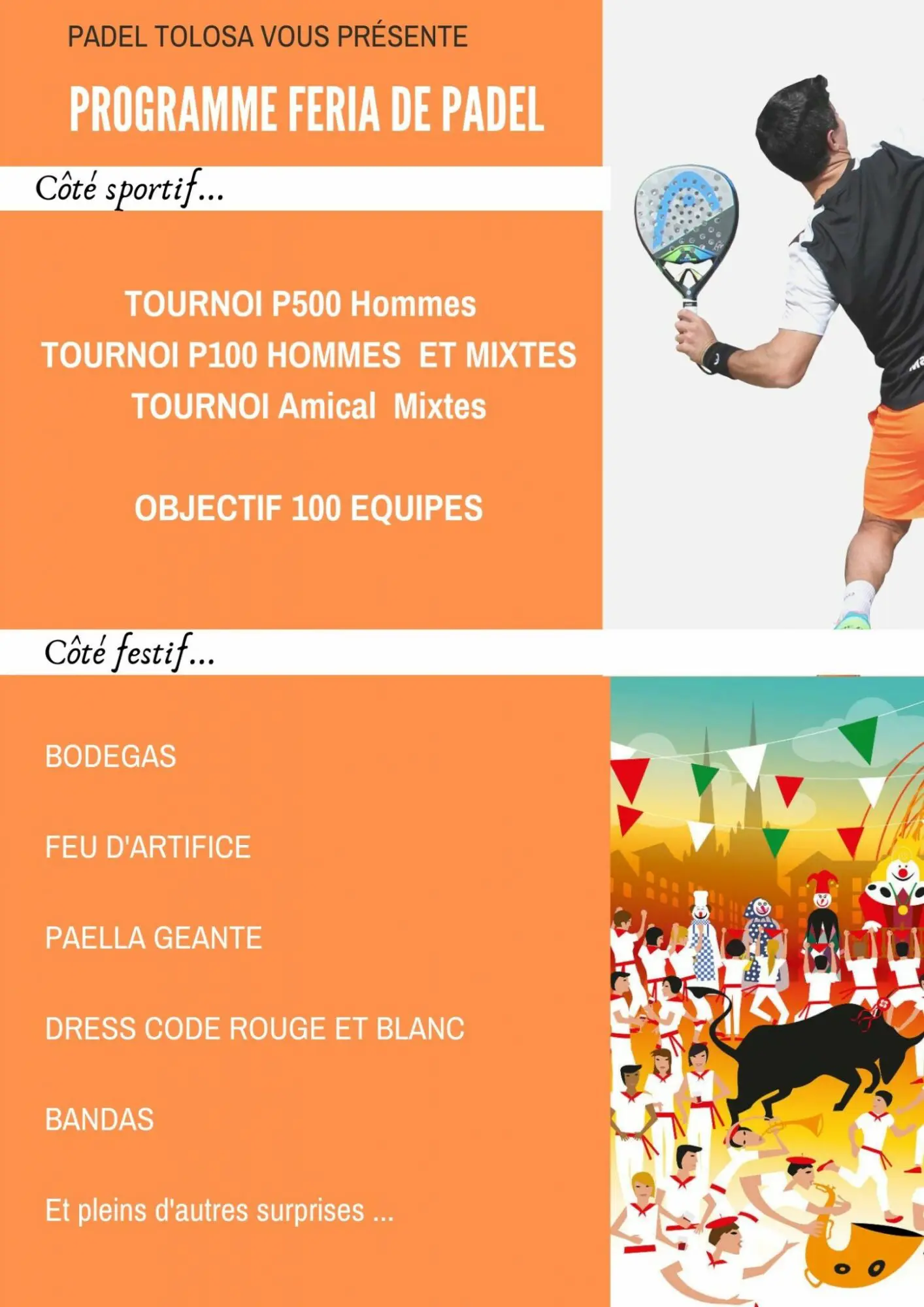 Padel Tolosa organise les 1ers férias Padel Tolosa du 14 au 16 Juin. Un week-end de sport et de fêtes.