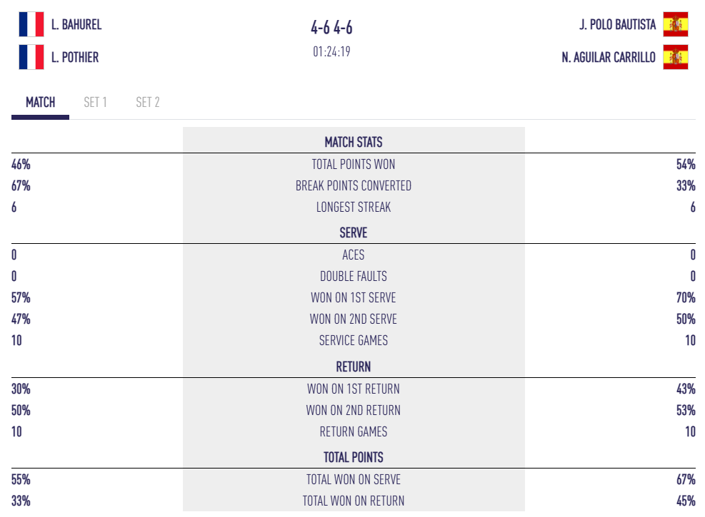 Le deuxième set est encore plus accroché. Pothier prend l’ascendant à la volée, Bahurel met du volume et les Françaises sont récompensées par un break à 2/1. Si le debreak immédiat relance les Espagnoles, les Tricolores ne lâchent rien et s’offrent même des occasions pour faire douter leurs adversaires. Mais à 5/4, sur un point litigieux, Aguilar et Polo arrachent le break puis concluent sans trembler : 6/4 6/4. Leur 29 points gagnants contre 19 côté français illustrent cette agressivité payante côté espagnol.