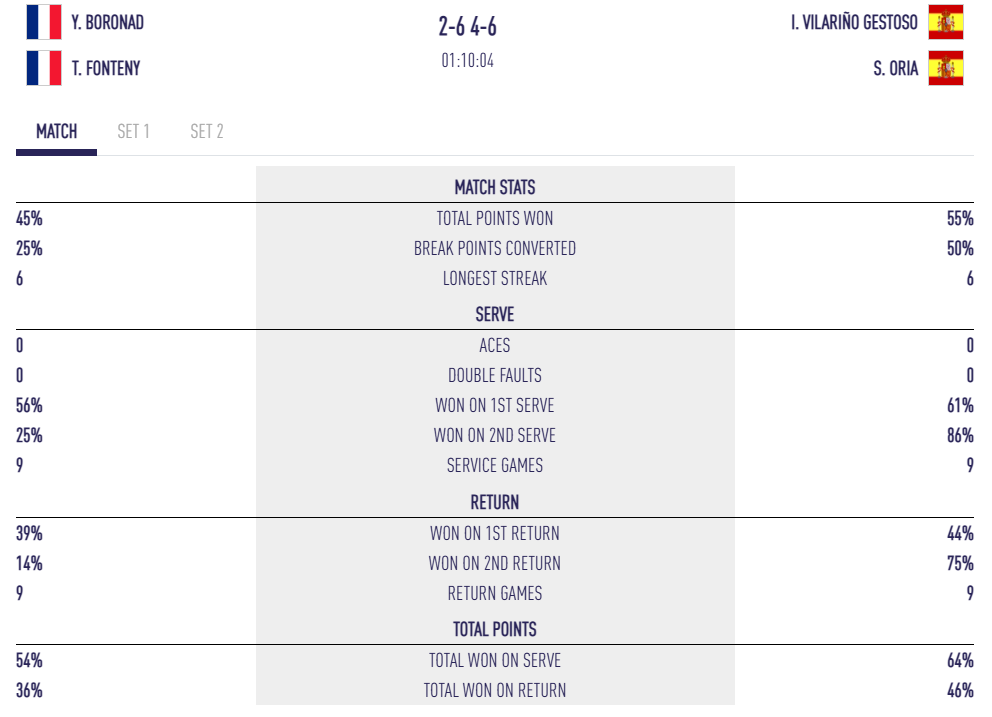Dès l’entame, les Espagnols imposent leur rythme. Plus solides à l’échange, ils trouvent rapidement la faille et breakent. Boronad et Fonteny peinent à installer leur jeu et concèdent le premier set 6/2.