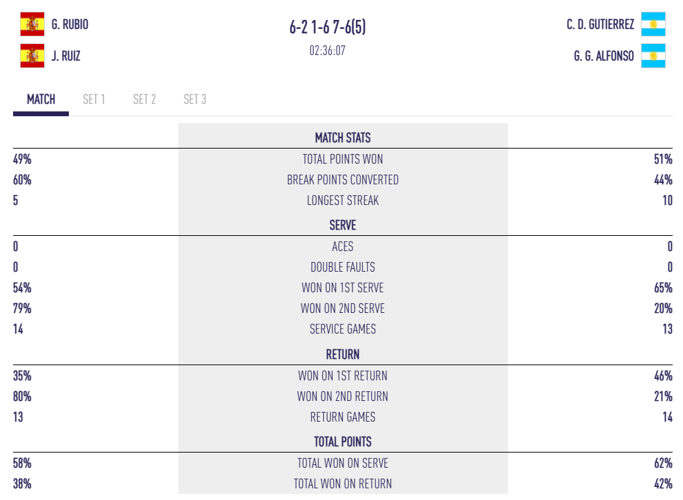 On a eu droit au match de la journée à Roland-Garros. Plus de 2h36 d’un combat acharné, un scénario renversant et une ambiance de feu pour voir Rubio et Ruiz renverser Sanyo Gutiérrez et Gonzalo Alfonso : 6/2 1/6 7/6(5).