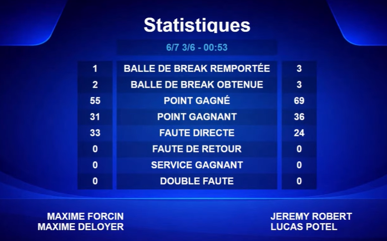 Portés par un Jérémy Robert étincelant, solides dans tous les compartiments du jeu, Potel / Robert prennent le dessus. Plus justes, plus constants, ils s’imposent 6/3 et concluent la rencontre avec autorité.