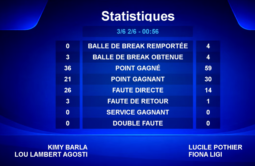 Fiona Ligi se montre particulièrement inspirée, enchaînant les coups gagnants et faisant lever le public venu en nombre. Malgré la résistance de Barla / Lambert Agosti, l’écart se creuse.