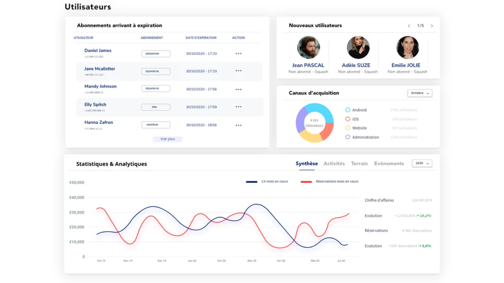 Pilotez votre activité d’une main de maître. Que vous soyez propriétaire d’un club ou d’une centaine, accédez à toutes vos données et performances sur votre tableau de bord centralisé.