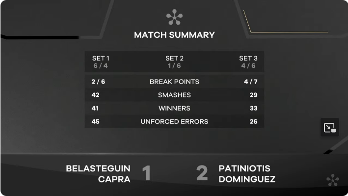 Avec quasiment deux fois moins de fautes non provoquées que leurs adversaires, Dominguez et Patiniotis, qui avaient du mal à retenir leurs larmes à l’issue de la rencontre, s’offrent une vraie victoire de prestige. Ils rejoueront demain face à Edu Alonso et Alex Arroyo, qui ont disposé, en trois sets également, de Muñoz / Bautista (4/6 7/6 6/2).