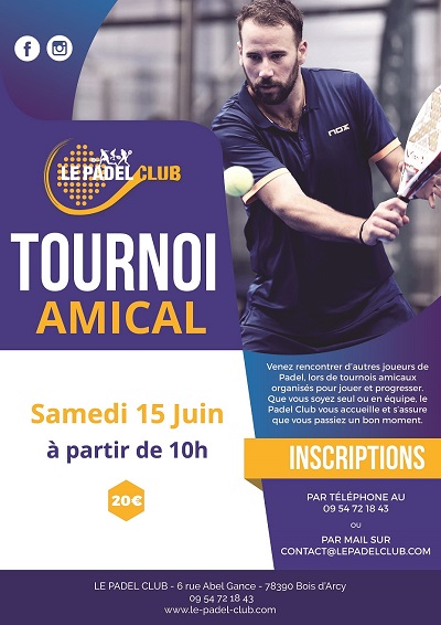 – Samedi 15 Juin, nous vous proposons un tournoi amical (Niveaux 3/4/5). Venez découvrir l’esprit convivial du Padel lors de ce tournoi amical ! Femmes et Hommes seront mélangés dans le même tableau lors de ce tournoi.