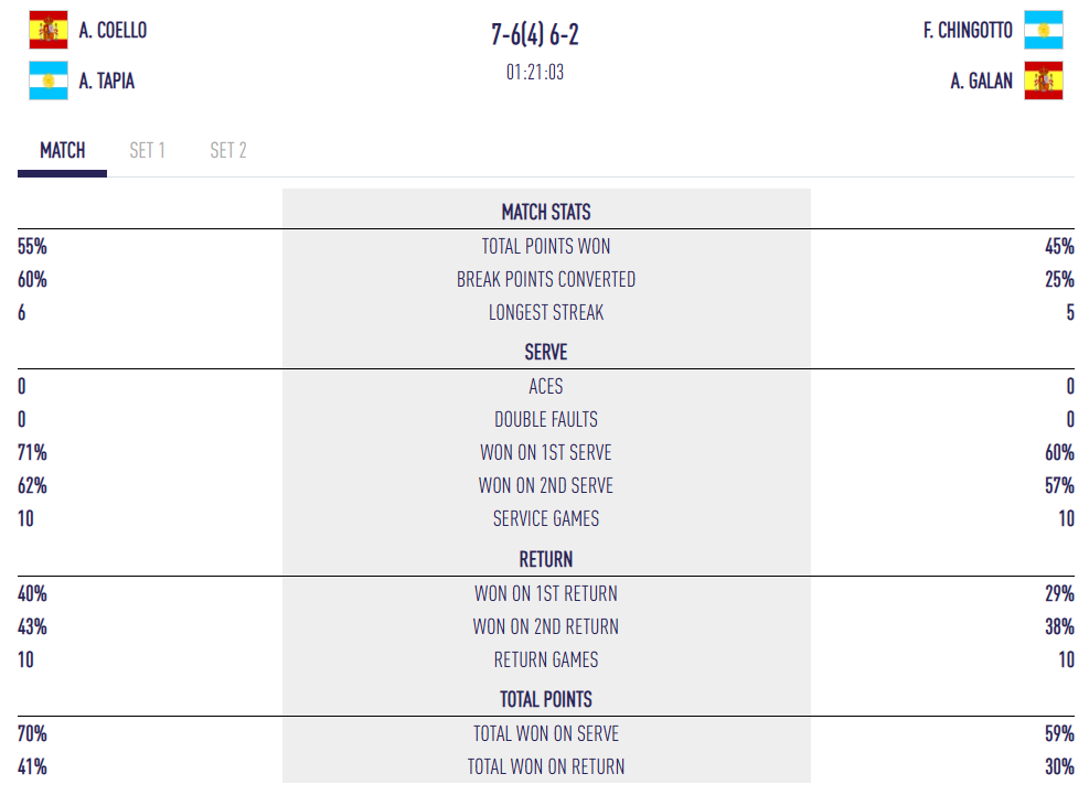 Le début de match est pourtant idéal pour Galán et Chingotto, très concentrés et bien en place. Face à eux, un Coello fébrile, en difficulté en défense et auteur de plusieurs fautes directes. De l’autre côté, Tapia démarre fort, mais cela ne suffit pas à éviter un break d’entrée en faveur de la tête de série 2. Grâce à une stratégie bien pensée, jouer vite dans les pieds et casser le rythme, Chingotto et Galán mènent 4/2.