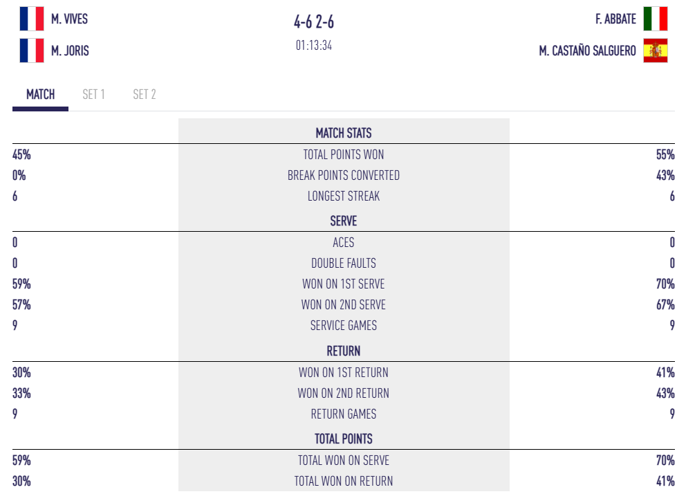 Portés par ce premier set, Abbate et Castaño prennent confiance et serrent le jeu. Ils breakent d’entrée et dictent les longs échanges. Les Français ne lâchent rien, mais baissent en intensité physique et manquent de réalisme dans les points importants. À 5/2, ils craquent une dernière fois : le match se termine 6/2.
