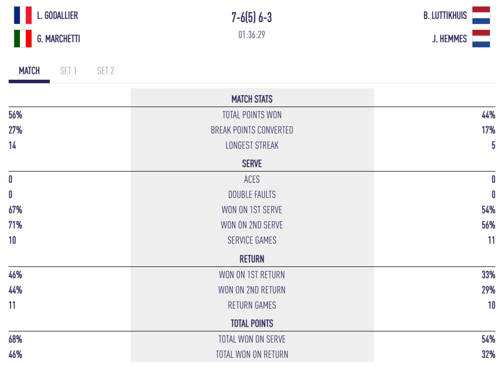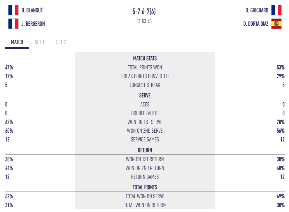 Les stats confirment l’intensité : 53 % des points remportés par Guichard / Dorta contre 47 % pour Blanqué / Bergeron, et une meilleure efficacité sur les balles de break (29 % contre 17 %). Guichard confirme ainsi sa dynamique, lui qui sort tout juste d’un titre de champion de France décroché face… à Blanqué.
