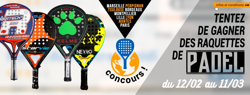 Avec PADEL AROUND, tentez de gagner 1 raquette des marques STARVIE, KELME PADEL, ROYAL PADEL ou NEXXO en étant le joueur le plus actif. Ce concours a lieu dans 9 villes :