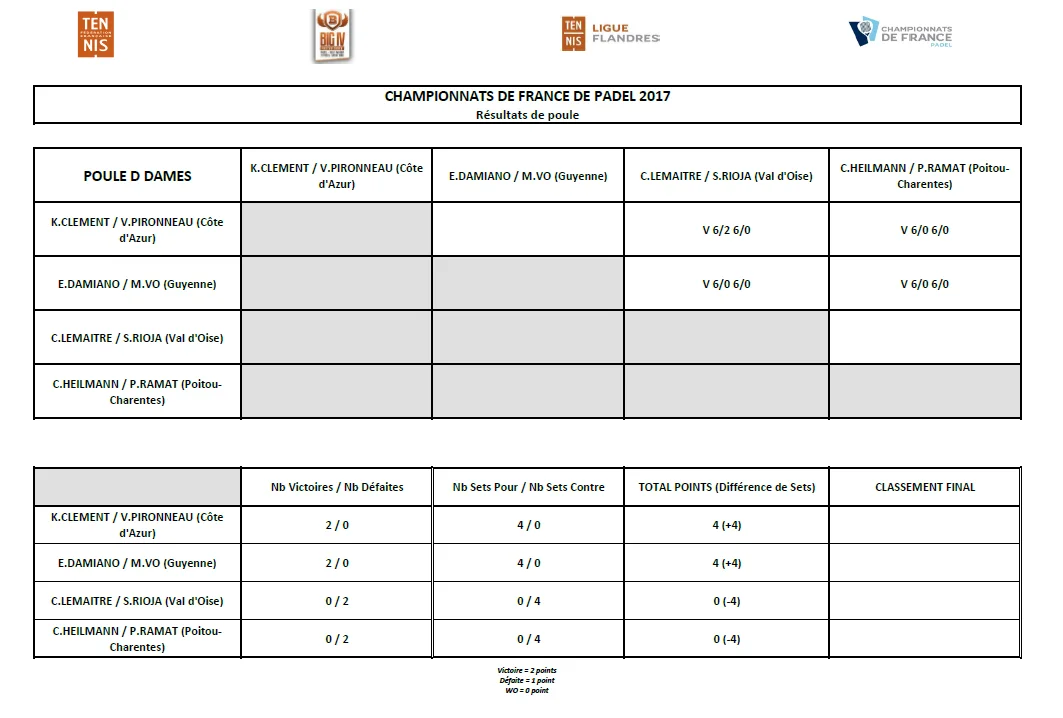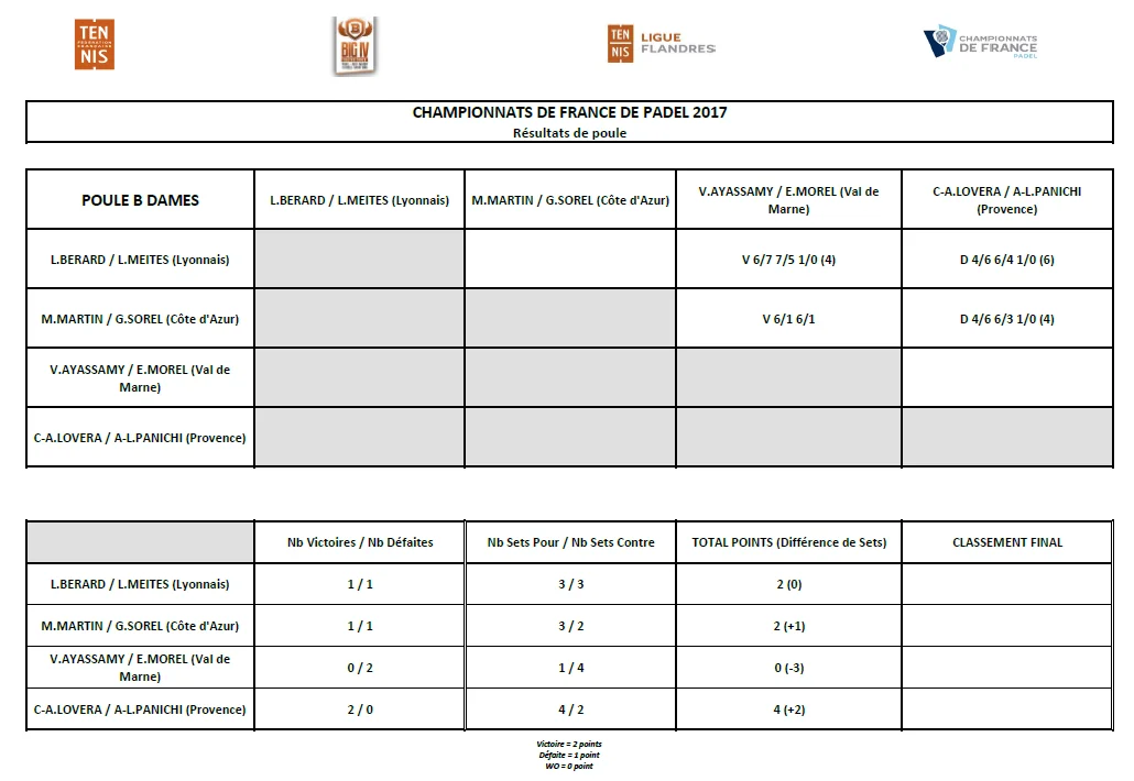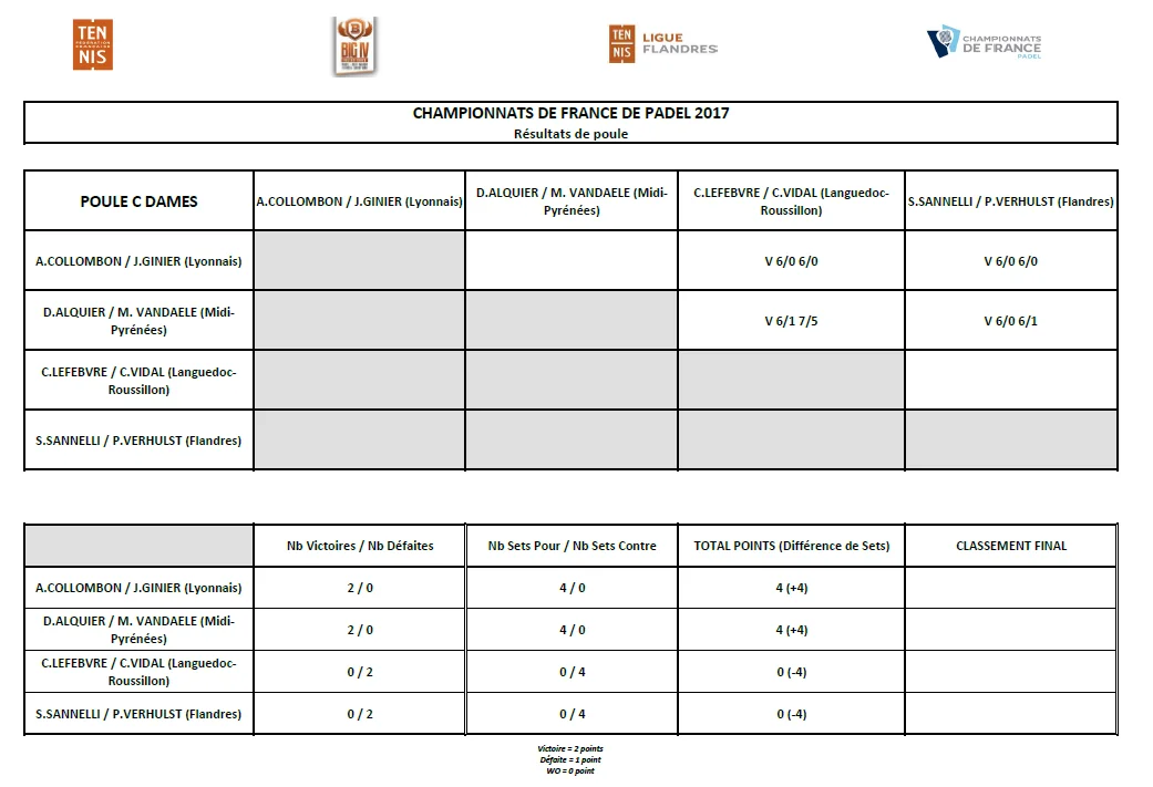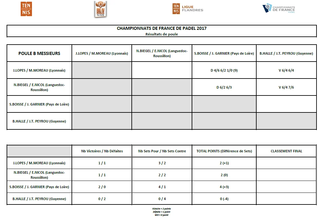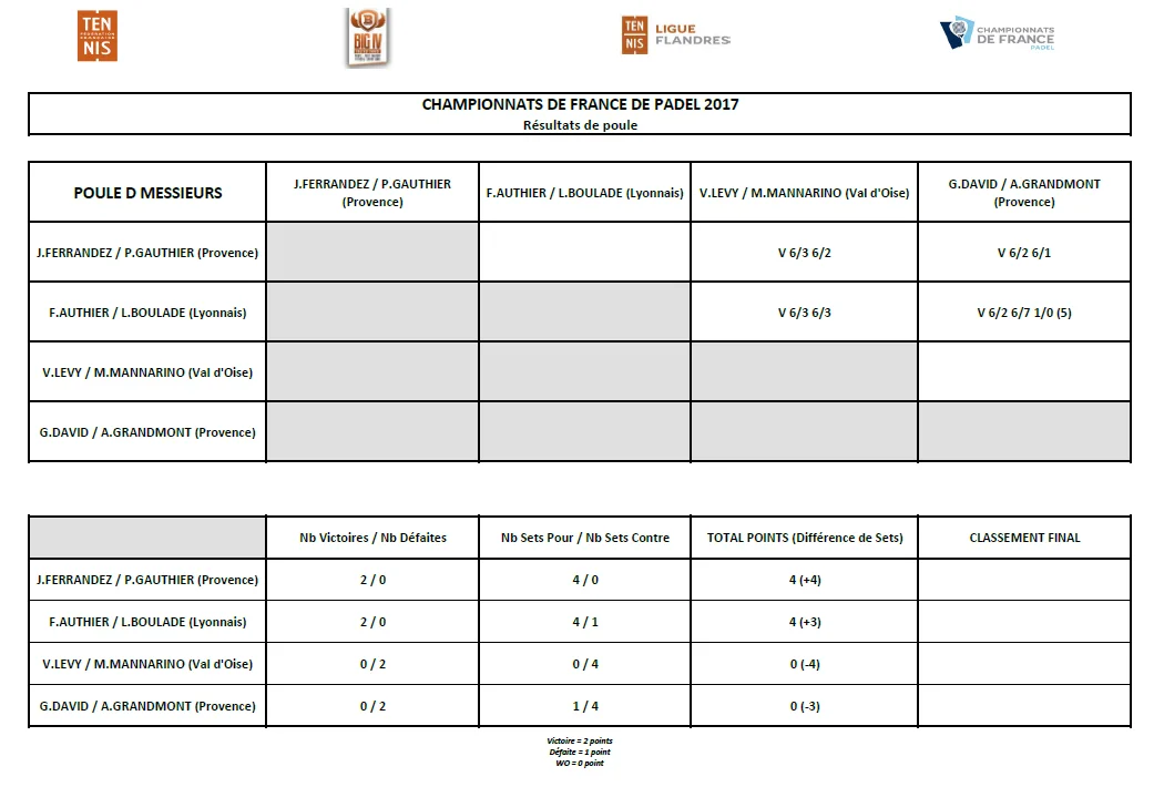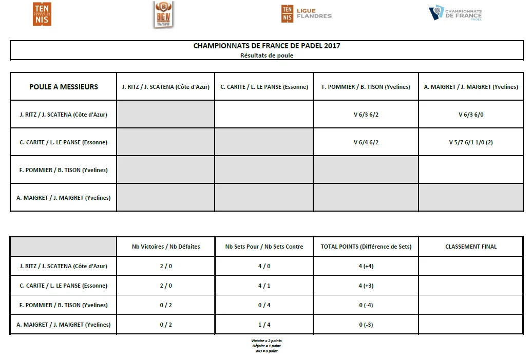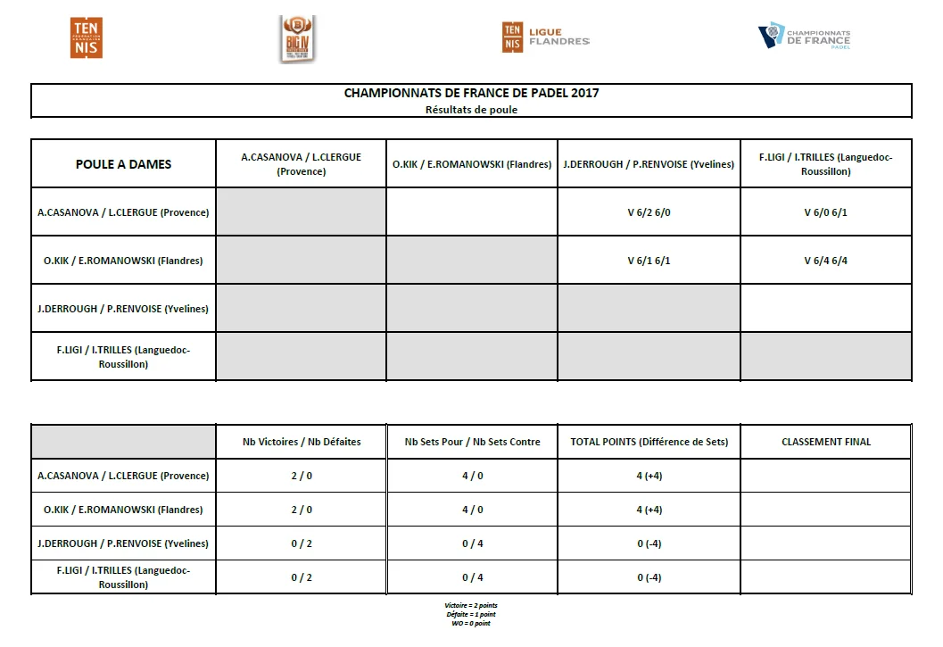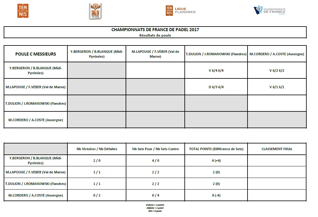 Résultat J1 des championnats de France de padel 2017. Demain débutera la fin des matchs de poule.