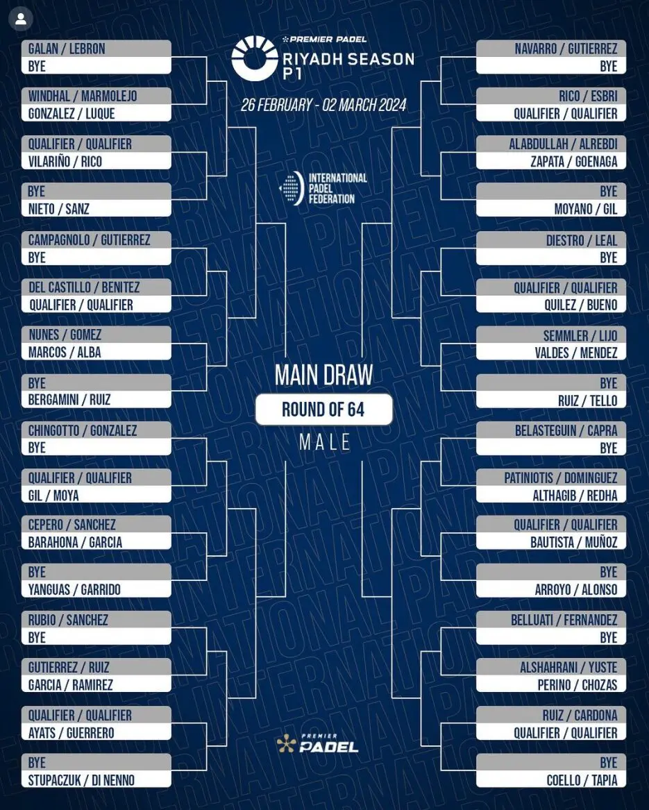 Dans le tournoi masculin, composé de 48 paires, les 16 têtes de série entreront directement en lice au deuxième tour. Les numéros 1 mondiaux, Juan Lebron et Ale Galan, se retrouvent dans la même moitié que Franco Stupaczuk et Martin Di Nenno.