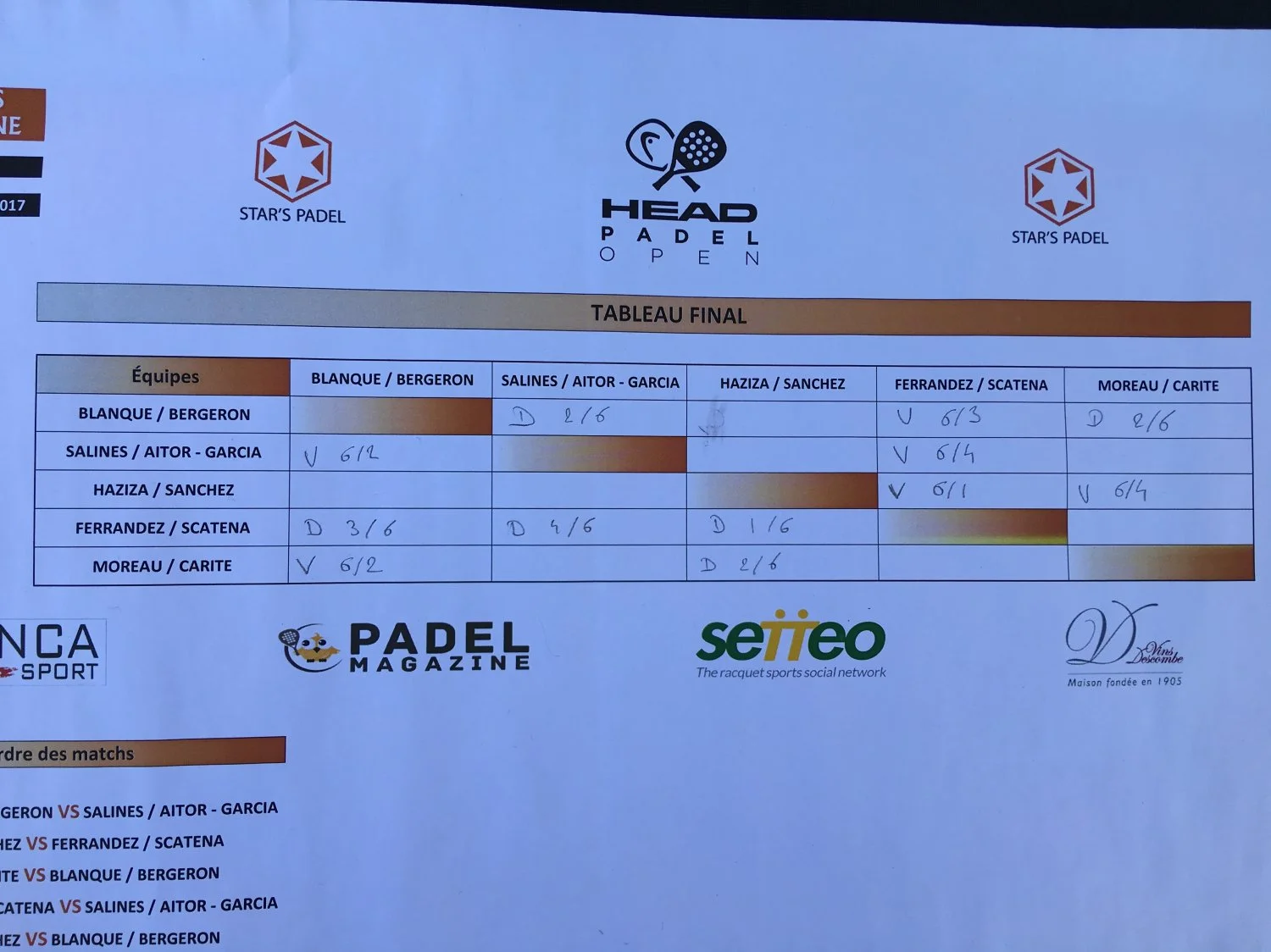Un sans-faute pour l’instant de la paire Sanchez / Haziza qui a battu la paire Moreau / Carité et Scatena / Ferrandez et de la paire espagnole Salines / Garcia. Ces deux paires joueront le tournoi vers 16h.