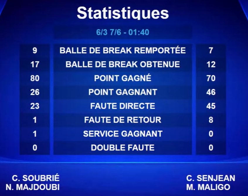 Dans ce moment clé, Soubrié / Majdoubi font la différence. Plus solides, plus expérimentées, elles serrent le jeu et concluent 7/6.