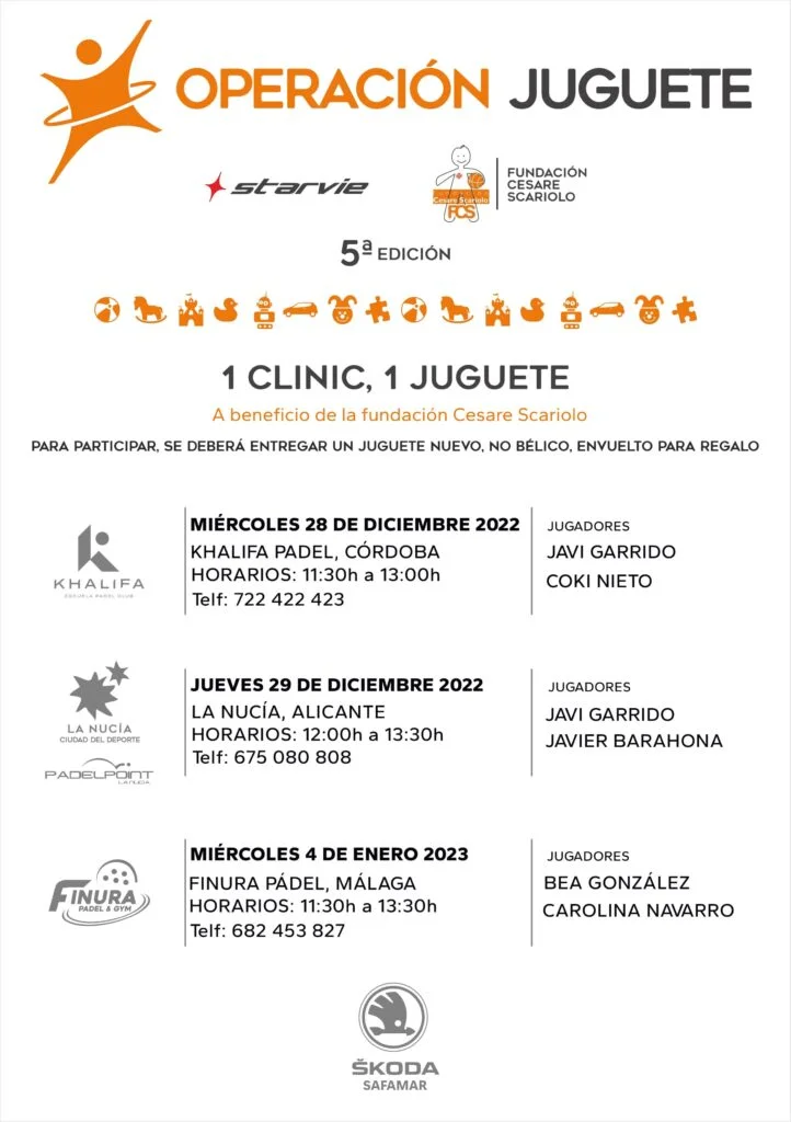 Pour cela la marque espagnole propose des clinics avec ses meilleurs joueurs : Bea González, Coki Nieto, Javi Garrido, Carolina Navarro et Javier Barahona. Et pour pouvoir participer à ces clinics, il faudra absolument offrir un jouet neuf. La cinquième édition de cette opération se fera sur trois villes : Córdoba, Alicante et Málaga.